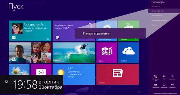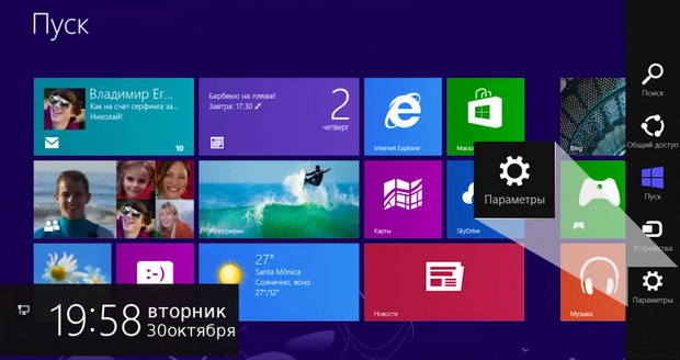 А) Перемістіть курсор в правий верхній кут і проведіть його вниз. В меню, що з'явилося, виберіть пункт "Параметры".