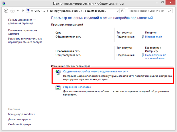 3. В "Центре управления сетями и общим доступом" виберіть пункт "Создание и настройка нового подключения или сети". Далі налаштування ідентичне Windows 8.