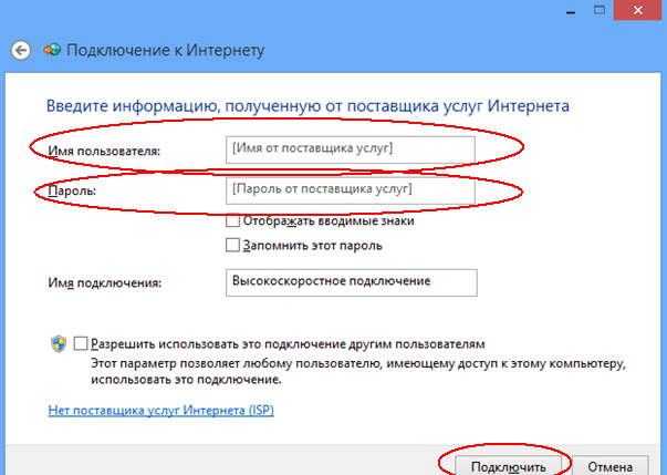 7. Вводимо логін і пароль, указані в договорі, ставимо галочку "Запомнить этот пароль". Післе того коли все введено, натискаємо кнопку "Подключить".