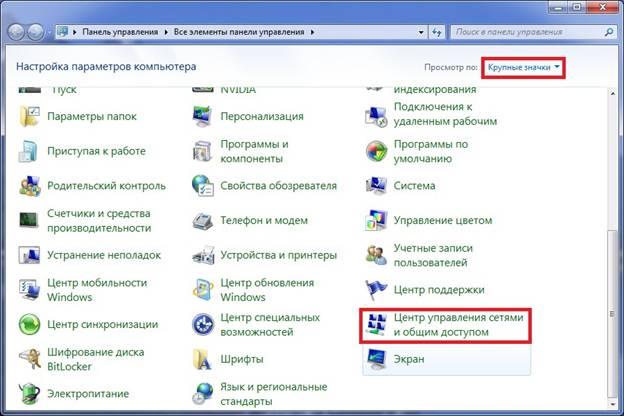 3.В меню "Просмотр по:" вибираємо "Крупные значки". Заходимо в "Центр управления сетями и общим доступом"
