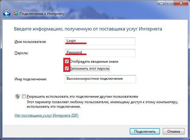 7. Вводимо логін і пароль, указані в договорі, ставимо галочку "Запомнить этот пароль"